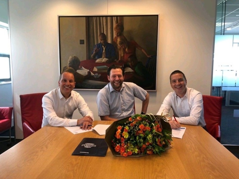 Martijn Schakelaar en Guido van Zijl bekrachtigden afgelopen week namens Vrieling Adviesgroep de sponsorovereenkomst met Businessclub038 en daarmee met Landstede Hammers.
